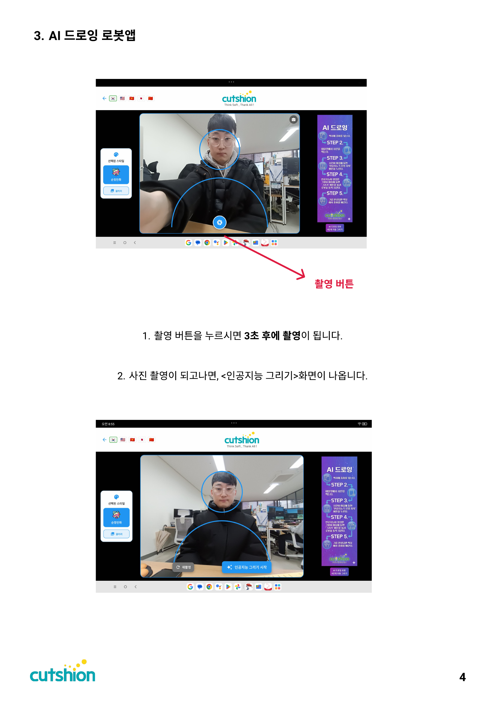 1. 촬영 버튼을 누르시면 3초 후에 촬영이 됩니다. 2. 사진 촬영이 되고나면, 인공지능 그리기 화면이 나옵니다.