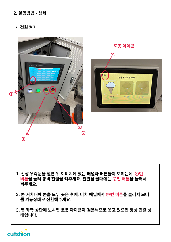 8분 읽기·최종 업데이트 2026-04-052-2. 전원 켜기ICE CREAM ROBOT · 1.0.0 이전2-1. 부품조립다음 2-3. 운영 준비이 페이지가 도움이 되었나요? 도움됨 개선 필요